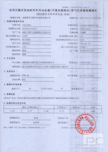 車輛原排:煙度值>2.5m-1,60%工況下排溫<250℃,時速<50Kw/h,發動機無燒機油及竄缸現象。