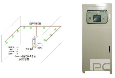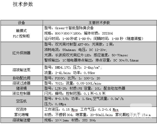 Green-Y智能型除臭設備由Green-Y型控制裝置、紅外線探測裝置、除臭工作液供應裝置、壓縮空氣裝置、霧化噴嘴裝置和保溫加熱以及管道吹掃等系統組成。